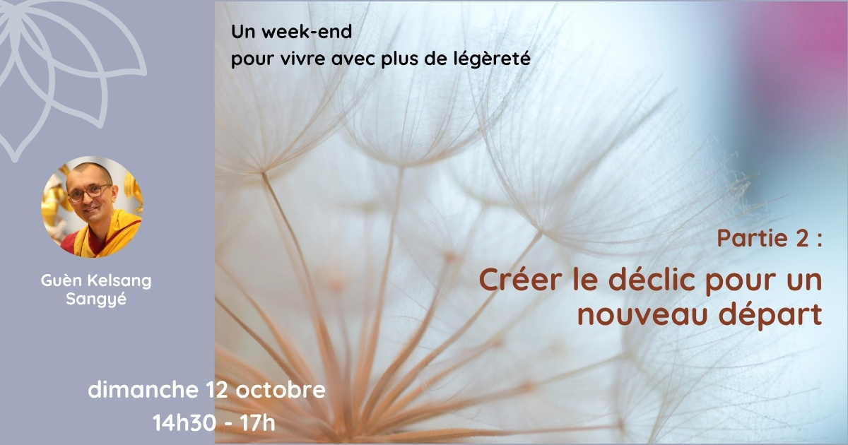 Lors de cette demi-journée, Guèn Sangyé nous guidera pour découvrir, à travers la sagesse bouddhiste et la méditation, comment chaque instant est une opportunité de lâcher prise, de se libérer des illusions et d’ouvrir la voie à un nouveau départ, plus lucide et plus paisible.