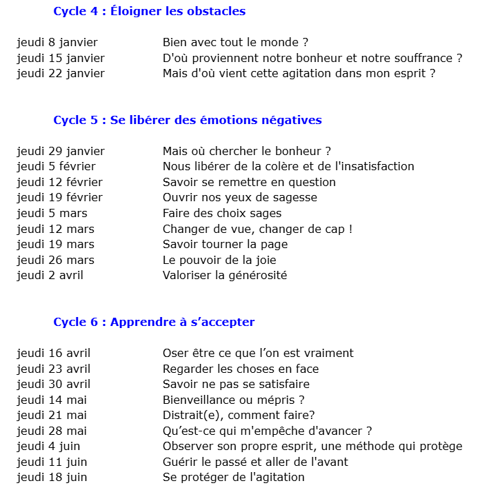 Au cours de ces séances, Guèn Sangyé nous apprendra à identifier et réduire les schémas d’habitudes mentales qui font souffrir. Venez découvrir des outils issus de la sagesse bouddhiste pour enrichir votre méditation et construire votre bonheur au quotidien