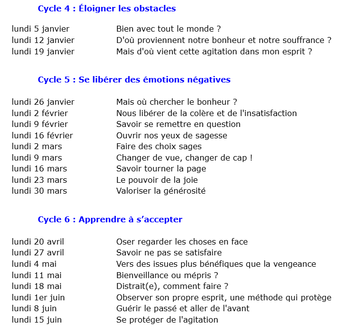 Au cours de ces séances, Guèn Sangyé nous apprendra à identifier et réduire les schémas d’habitudes mentales qui font souffrir. Venez découvrir des outils issus de la sagesse bouddhiste pour enrichir votre méditation et construire votre bonheur au quotidien.